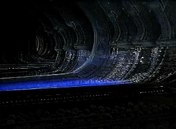 A downward shaft at the corner of the room lead to a huge chamber, perhaps a storage chamber or bay of some sort. Larger than two football fields, and sectioned into portions. Six or seven feet above the floor was a blue mist or beam of light that seems to whine when broken. Underneath this beam, were thousands of eggs. The eggs, about two feet tall, had organic life inside of them.