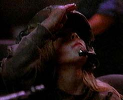 | Ripley and Newt quickly climb up into the safety of the drop ship and Bishop sends them out of there, missing the nuclear explosion. Unfortunately the queen had attached herself to the landing gear of the drop ship, waiting until the arrive upon the Sulaco to release herself. Bishop is torn in half and Ripley notices the queen closing in on Newt. She quickly yells at the beast to attract attention to herself. She then takes off past the pressure door escaping the queen. Undaunted, the queen studies her situation and attempted to snatch Newt from underneath the flooring. However, Newt is still as quick as ever, darting in and around the understructure beneath the queen. She managed to survive long enough for Ripley to return with the Power Loader, ready to deal with the queen. |